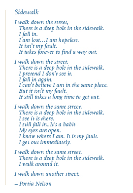| Many times people ask – how does psychotherapy work? While the process of therapy is tailored to meet each individual's or couple's needs, there are universal themes that are present in the progress of all clients. While I cannot tell you what the poet had in mind as she wrote the poem, "Sidewalk," it is beautiful exposition of the stages of a successful psychotherapy experience. It focuses on the aspects of awareness, insight and responsibility for the self – all-important ingredients in the process of healing and growth. |